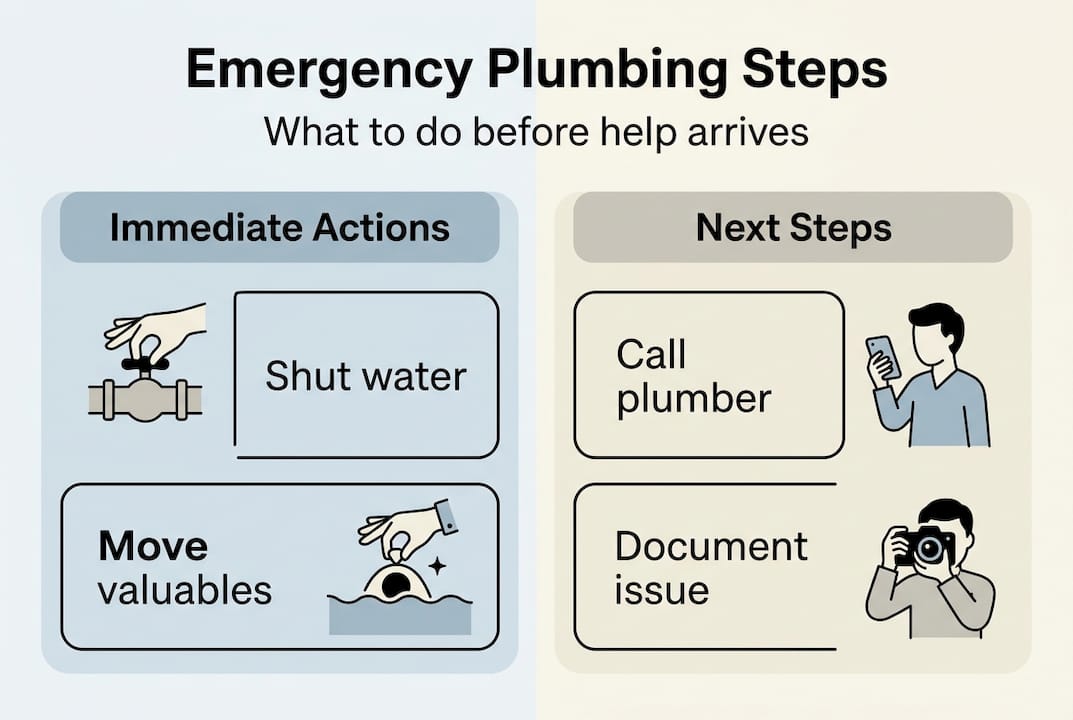 Once you know you need a plumber and have called, here is what you can do right away to limit the fallout.