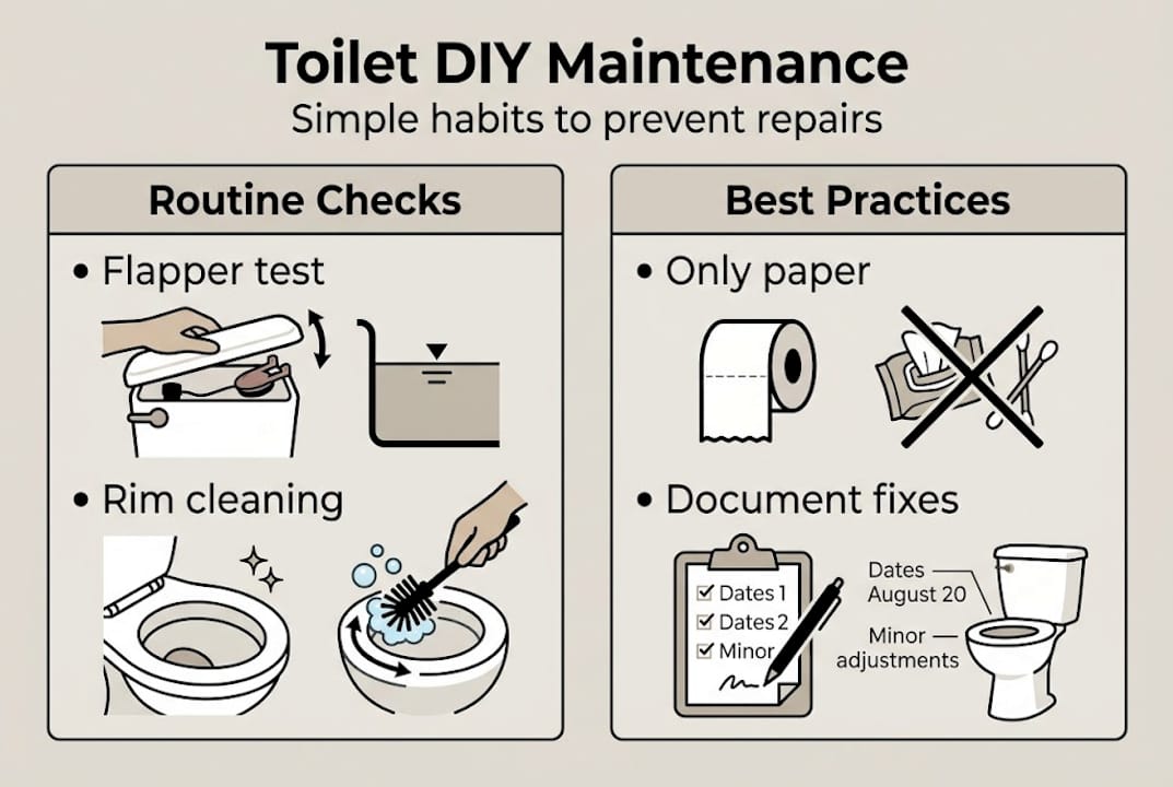 Inspect flappers, floats, and water levels at least once a year, clean rim holes annually, and check around the base after every flush if you suspect a developing leak.