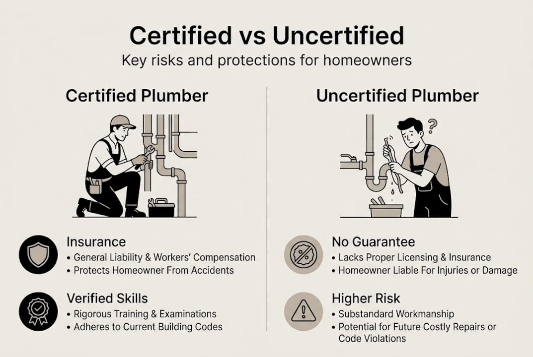 - Using uncertified plumbers increases risks of insurance voidance, costly repairs, and regulatory fines.