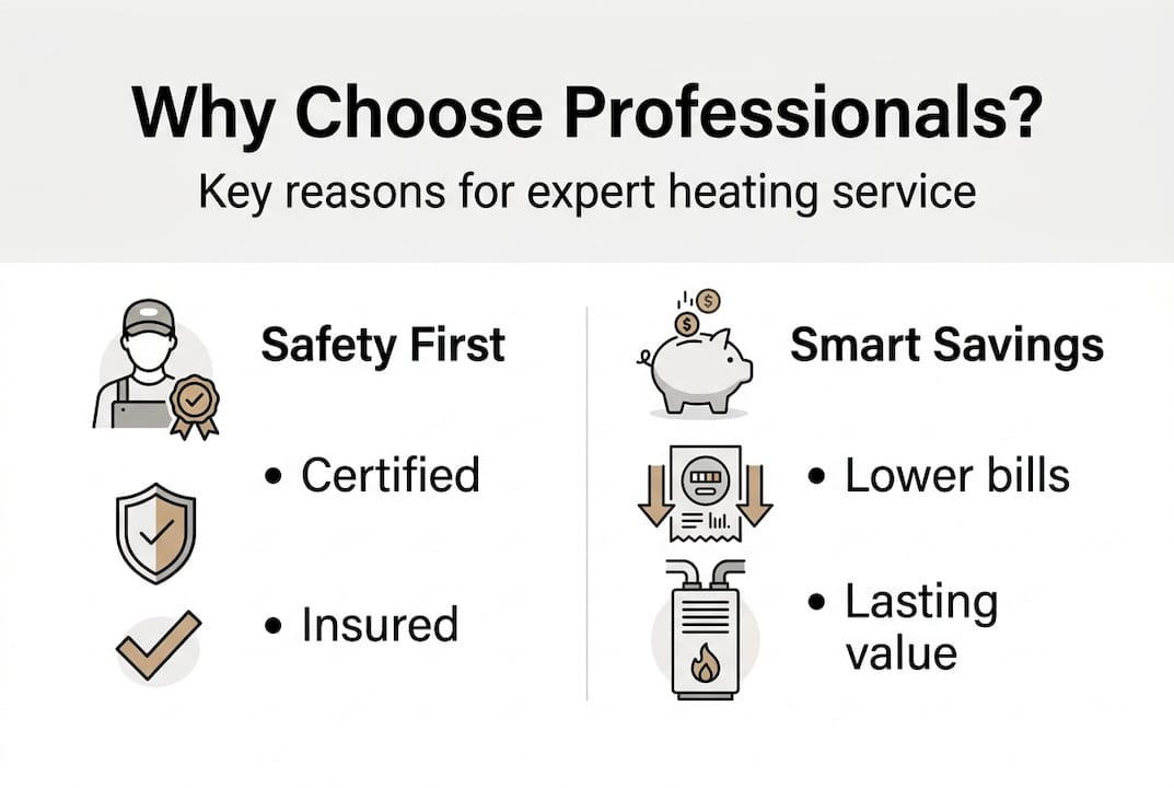 - Unqualified heating work risks gas leaks, carbon monoxide poisoning, and system failures.